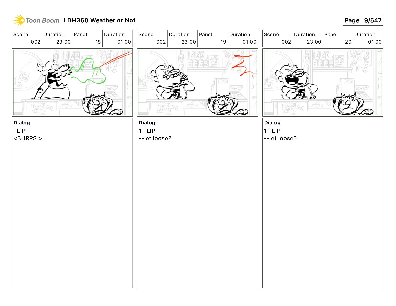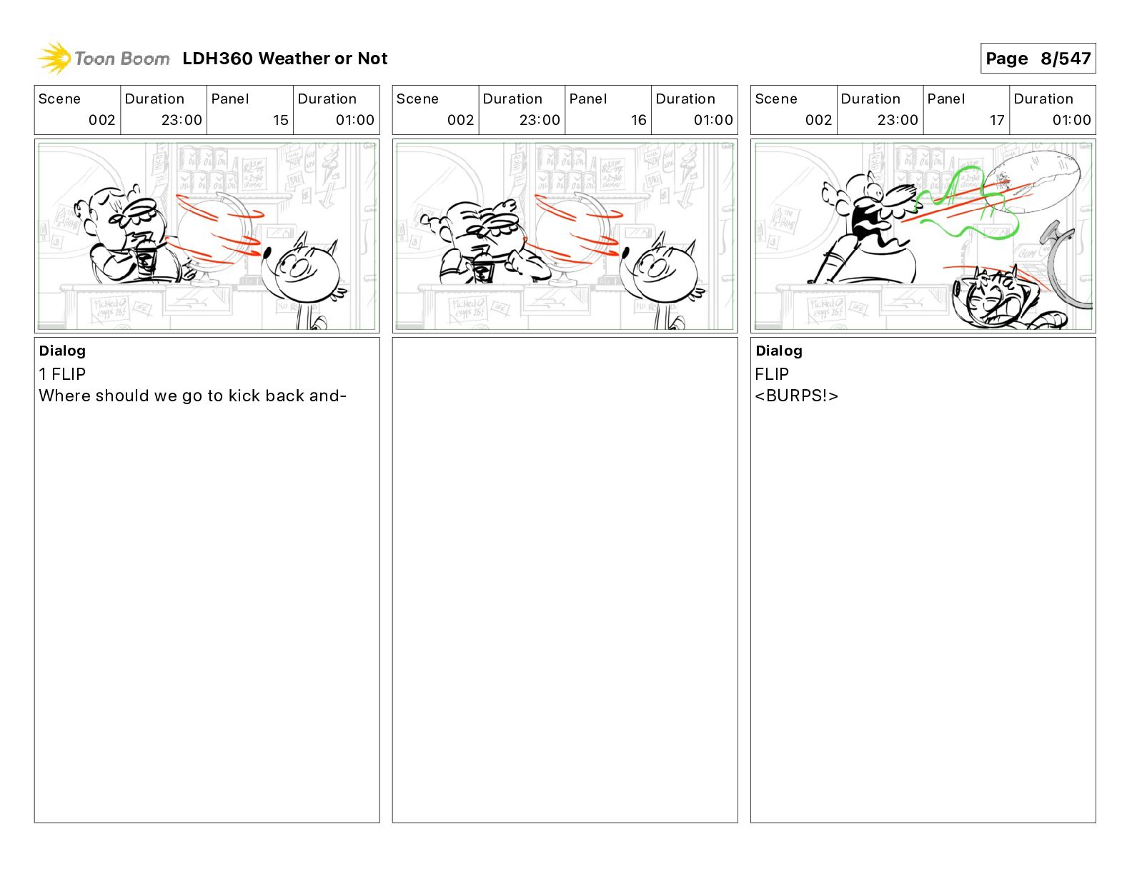 Dialog 1 FLIP Where should we go to kick back and- Scene 002 Duration 23 00 Panel 16 Duration 01 00 Scene 002 Duration 23 00 Panel 17 Duration 01 00 Dialog FLIP <BURPS!> LDH360 Weather or Not Page 8/547