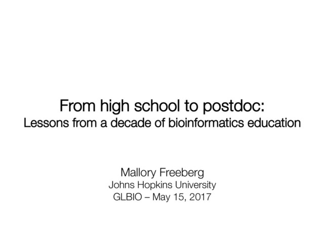 school Indiana, PA • Saint Vincent College Latrobe, PA! BS Bioinformatics • University of Michigan Ann Arbor, MI! PhD Bioinformatics • Johns Hopkins University! Baltimore, MD! Postdoctoral research fellow u Academic track
