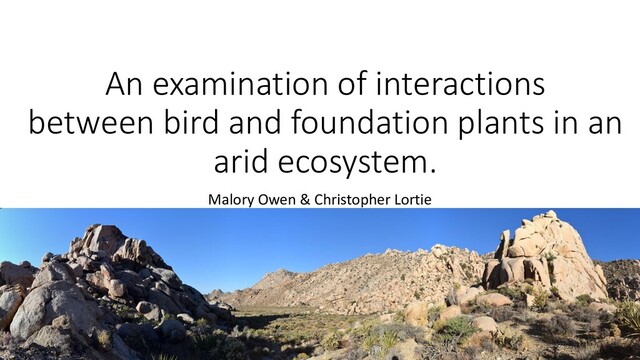 Positive interactions between plants and animals create habitat infrastructure on which many species rely, especially when the promotion of foundation species is involved. Mutualistic interactions between plants and birds (like pollination or seed dispersal) are dependent on both plant and bird phenology or cyclic/seasonal changes. However, phenology is plastic as photoperiod and temperature largely determine flowering & fruiting for plants and migration & breeding for birds. As our climate changes and habitats degrade, we must understand what interactions are at risk. That's why, in this study, we examined the relationships between birds, their community, their behavior, and their microhabitat associations.