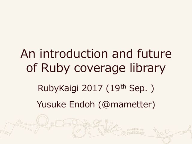 1], :branches=> {[:if, 0, 2]=>{ [:then, 1, 2]=>1, [:else, 2, 2]=>0}, [:if, 3, 3]=>{ [:then, 4, 3]=>0, [:else, 5, 3]=>1}}, :methods=>{ [:test_if, 1]=>3 }}} # target2.rb 1: def test_if_oneline(x) 2: p "x == 0" if x == 0 3: p "x != 0" if x != 0 4: end 5: 6: test_if_oneline(0) Line coverage 100% Branch coverage tells you there are untested cases