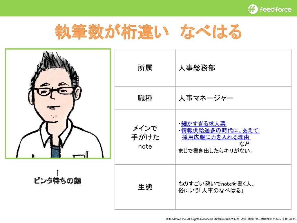 © feedforce Inc. All Rights Reserved. 本資料を無断で転用・改変・複製・第三者に開示することを禁じます。 執筆数が桁違い なべはる 所属 人事総務部