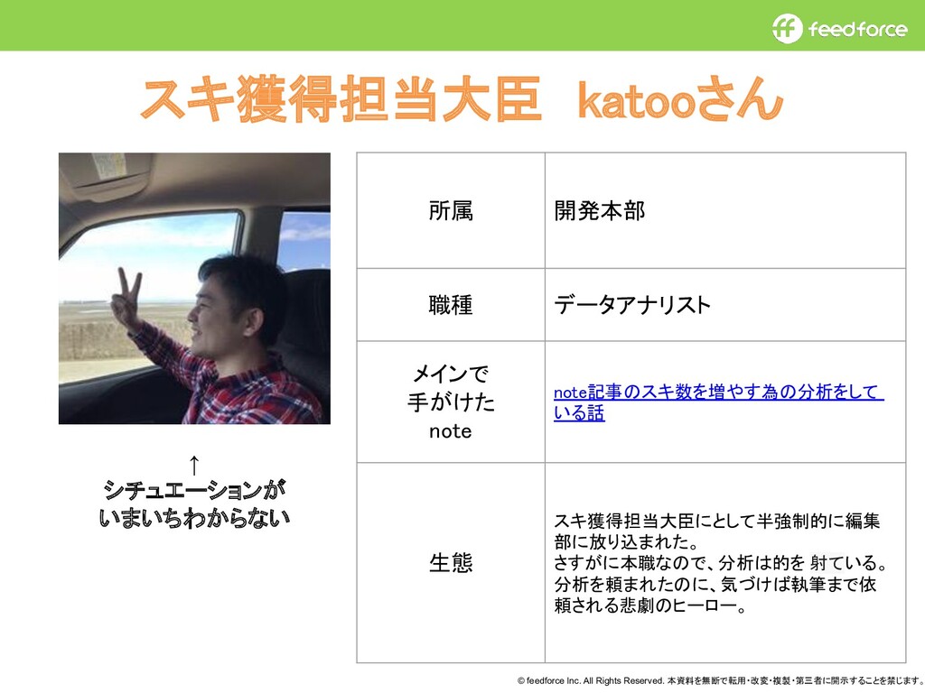 © feedforce Inc. All Rights Reserved. 本資料を無断で転用・改変・複製・第三者に開示することを禁じます。 スキ獲得担当大臣 katooさん 所属 開発本部