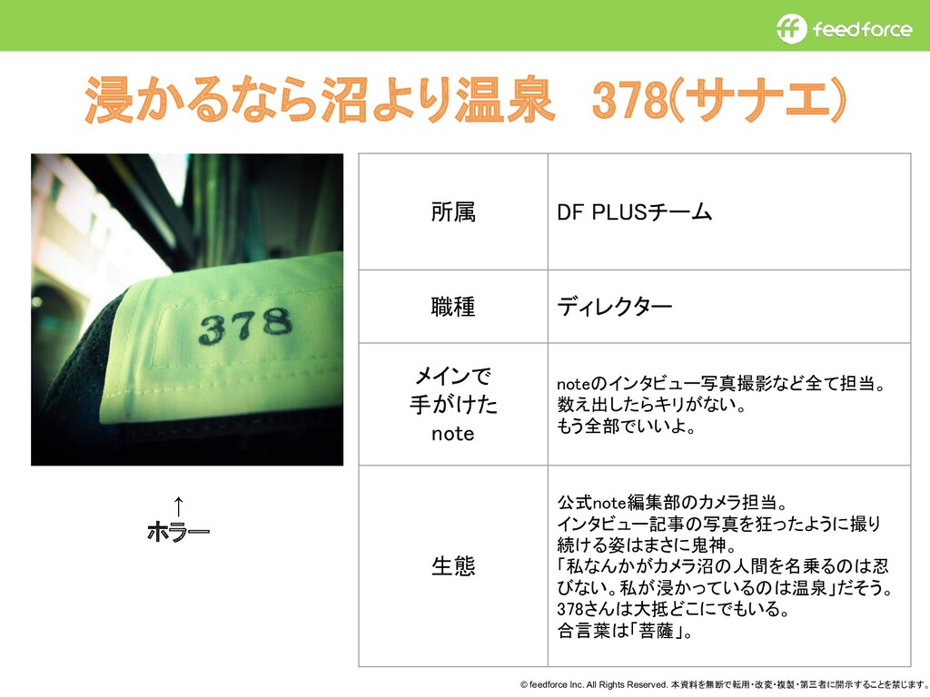 PLUSチーム 職種 ディレクター メインで 手がけた note noteのインタビュー写真撮影など全て担当。 数え出したらキリがない。 もう全部でいいよ。 生態 公式note編集部のカメラ担当。 インタビュー記事の写真を狂ったように撮り 続ける姿はまさに鬼神。 「私なんかがカメラ沼の人間を名乗るのは忍 びない。私が浸かっているのは温泉」だそう。 378さんは大抵どこにでもいる。 合言葉は「菩薩」。 ↑ ホラー