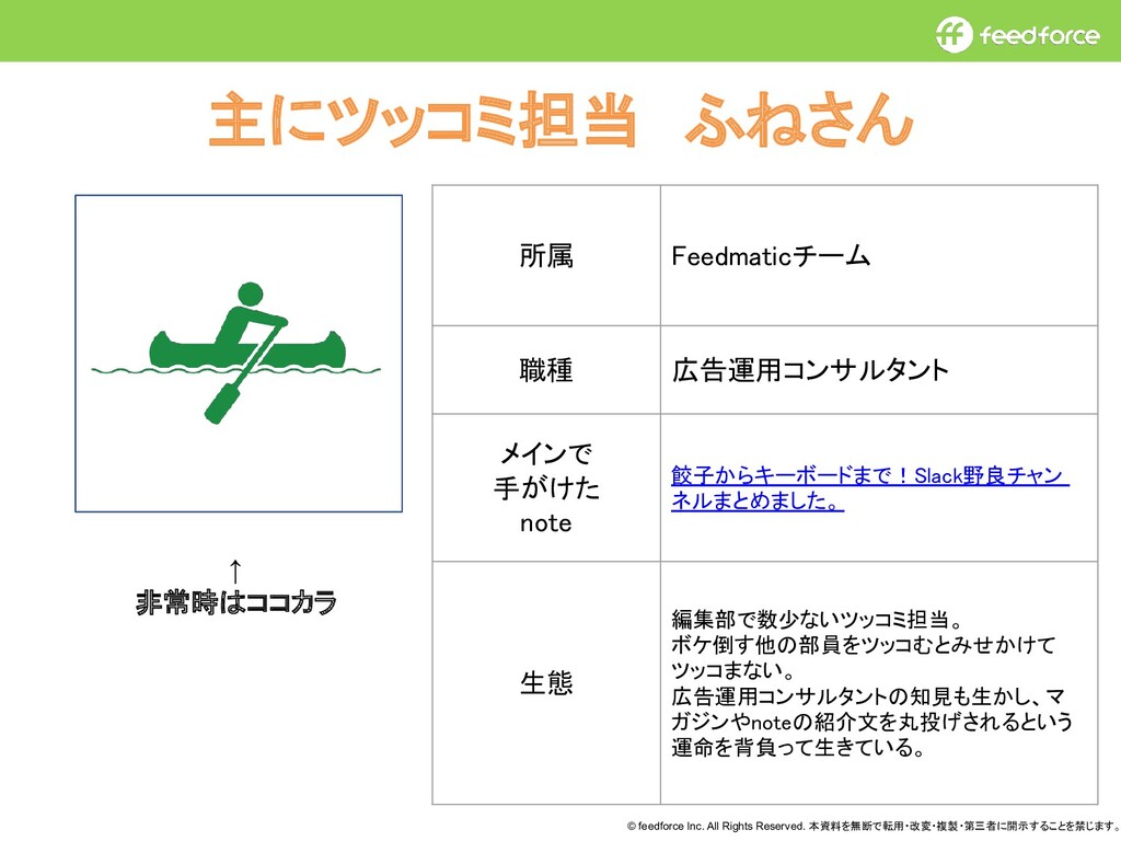 © feedforce Inc. All Rights Reserved. 本資料を無断で転用・改変・複製・第三者に開示することを禁じます。 主にツッコミ担当 ふねさん 所属 Feedmaticチーム