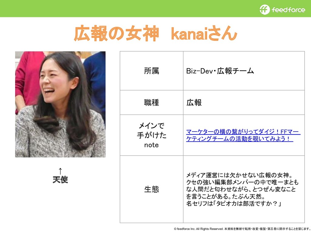 © feedforce Inc. All Rights Reserved. 本資料を無断で転用・改変・複製・第三者に開示することを禁じます。 広報の女神 kanaiさん 所属 Biz-Dev・広報チーム