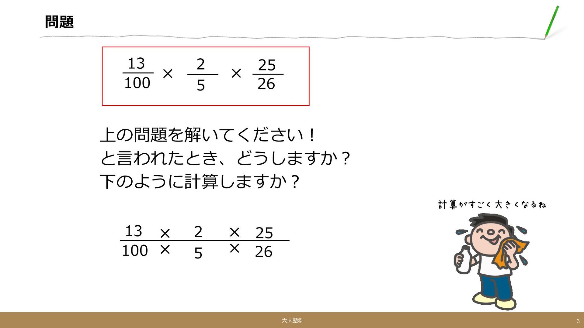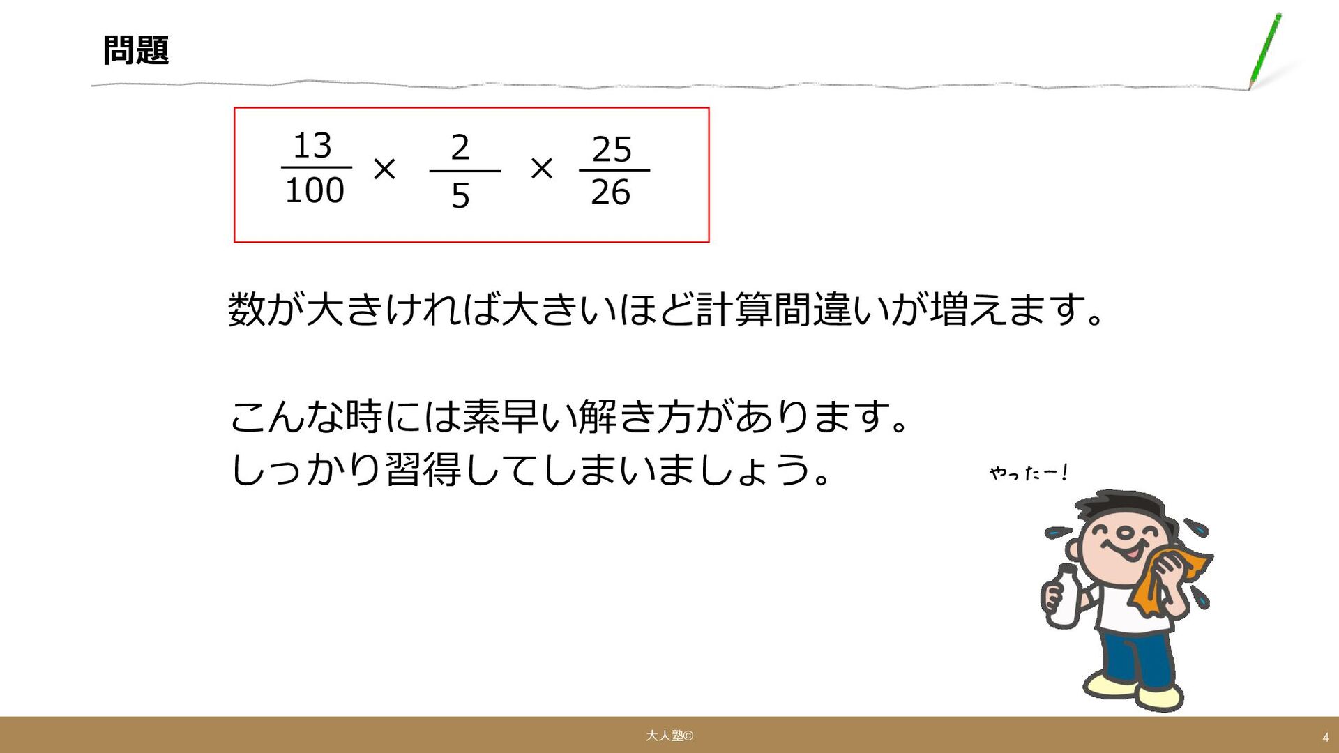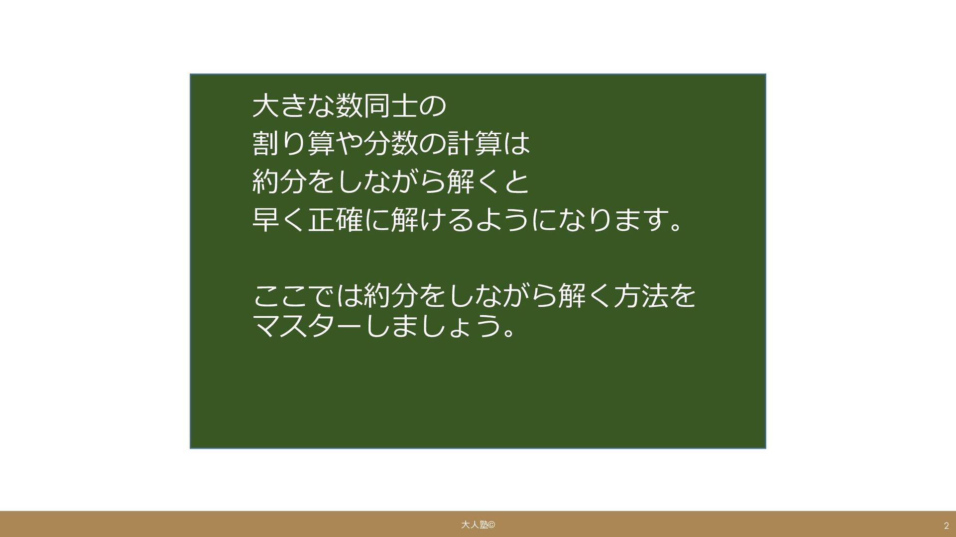 大きな数同士の 割り算や分数の計算は 約分をしながら解くと 早く正確に解けるようになります。 ここでは約分をしながら解く方法を マスターしましょう。 大人塾© 2