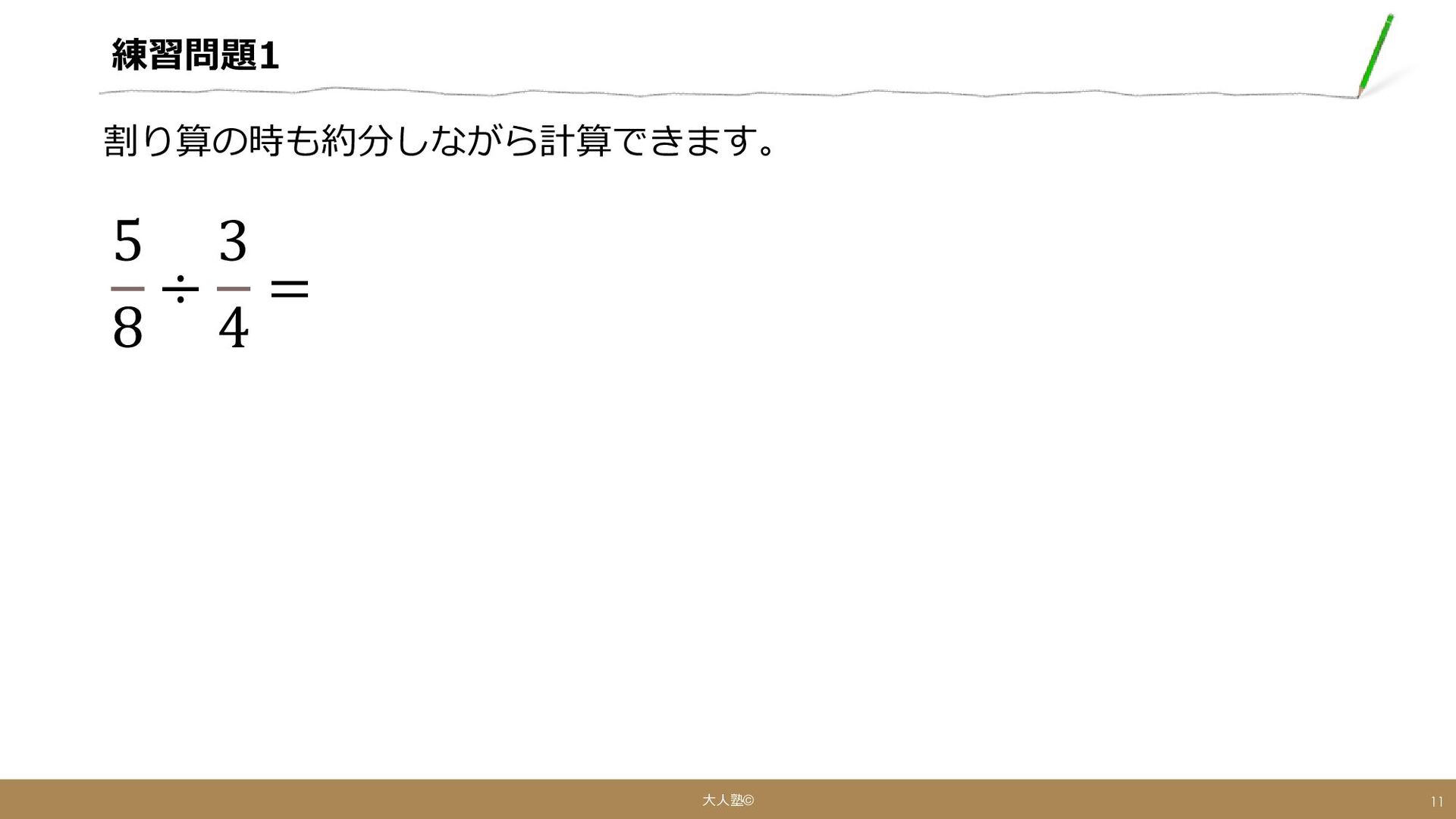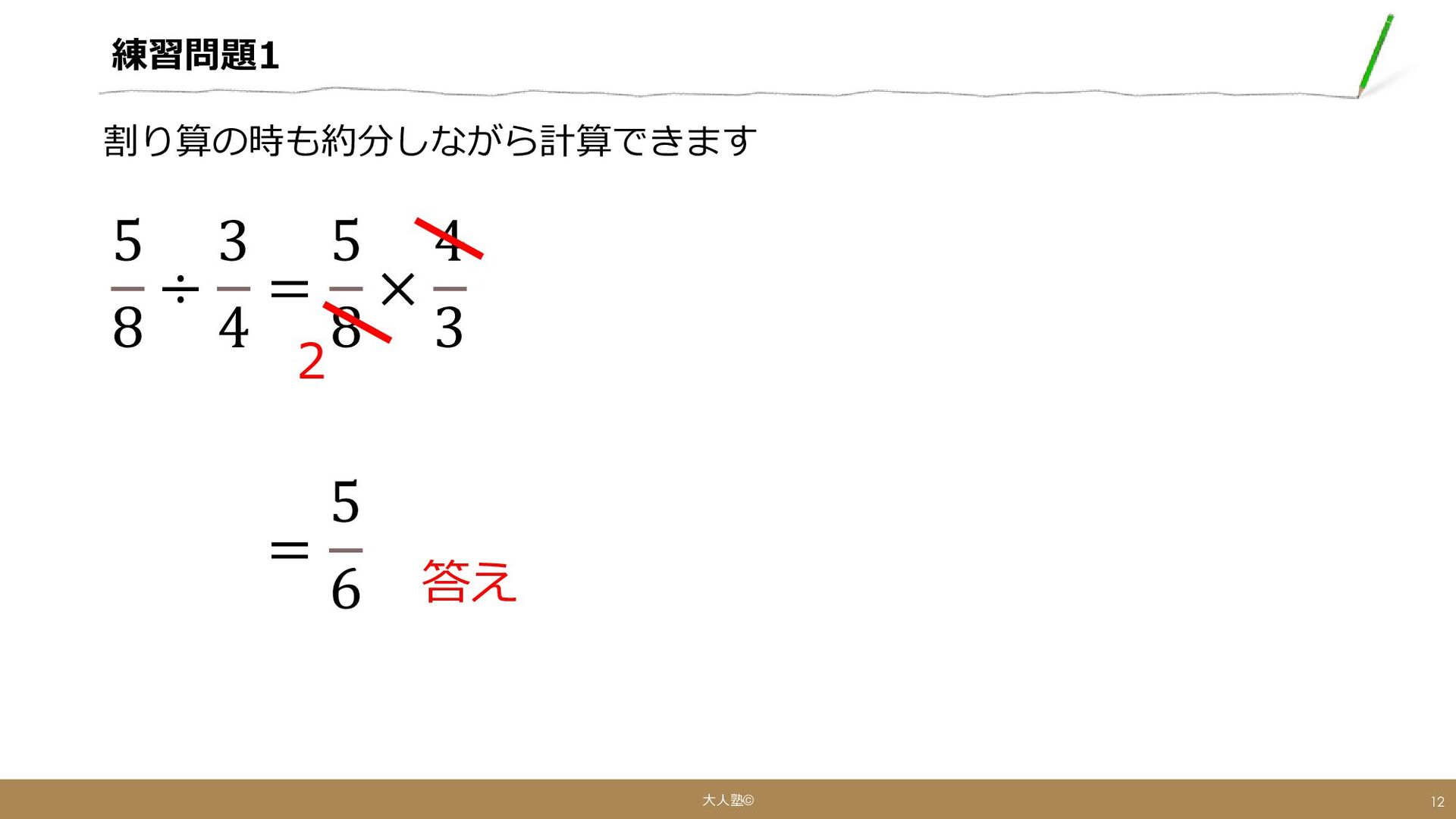 練習問題1 大人塾© 11 割り算の時も約分しながら計算できます。 5 8 ÷ 3 4 =