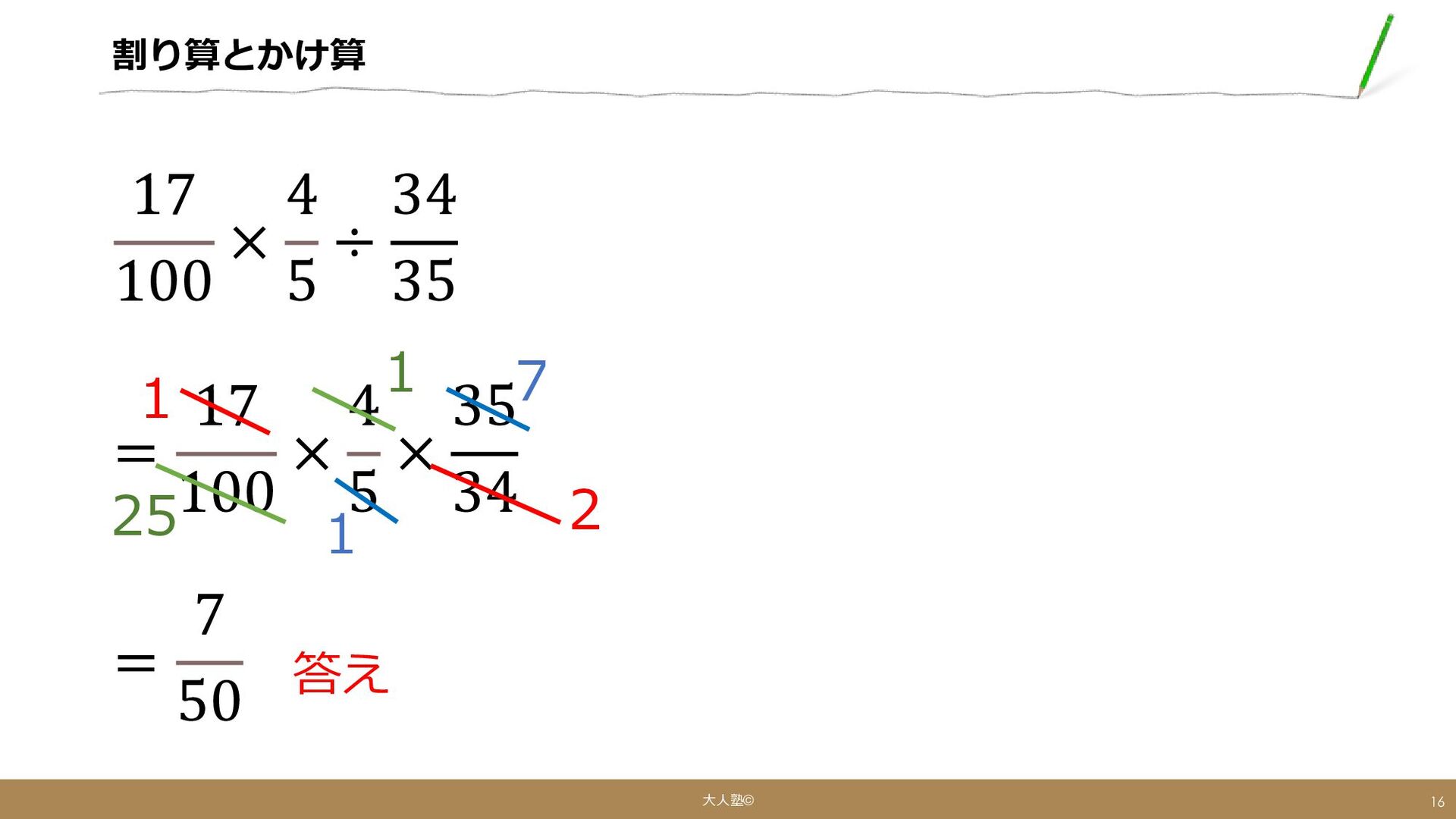 100 × 4 5 × 35 34 = 7 50 割り算とかけ算 大人塾© 16 2 1 1 25 答え 1 7