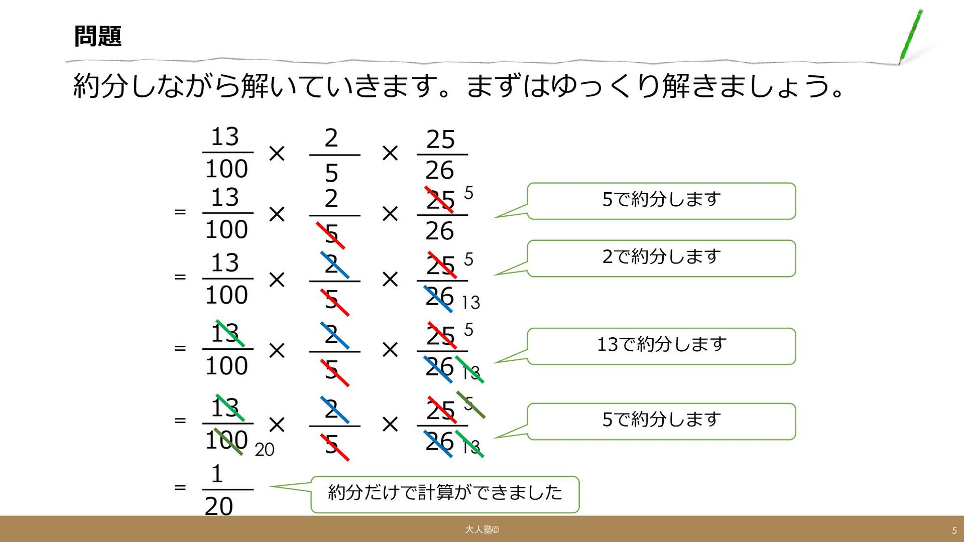 × 5 26 25 2 100 13 × × 5 5で約分します 2で約分します 5 26 25 2 100 13 × × 5 13 5 26 25 2 100 13 × × 5 13 13で約分します 5 26 25 2 100 13 × × 5 13 20 5で約分します = = = = = 20 1 約分だけで計算ができました 約分しながら解いていきます。まずはゆっくり解きましょう。