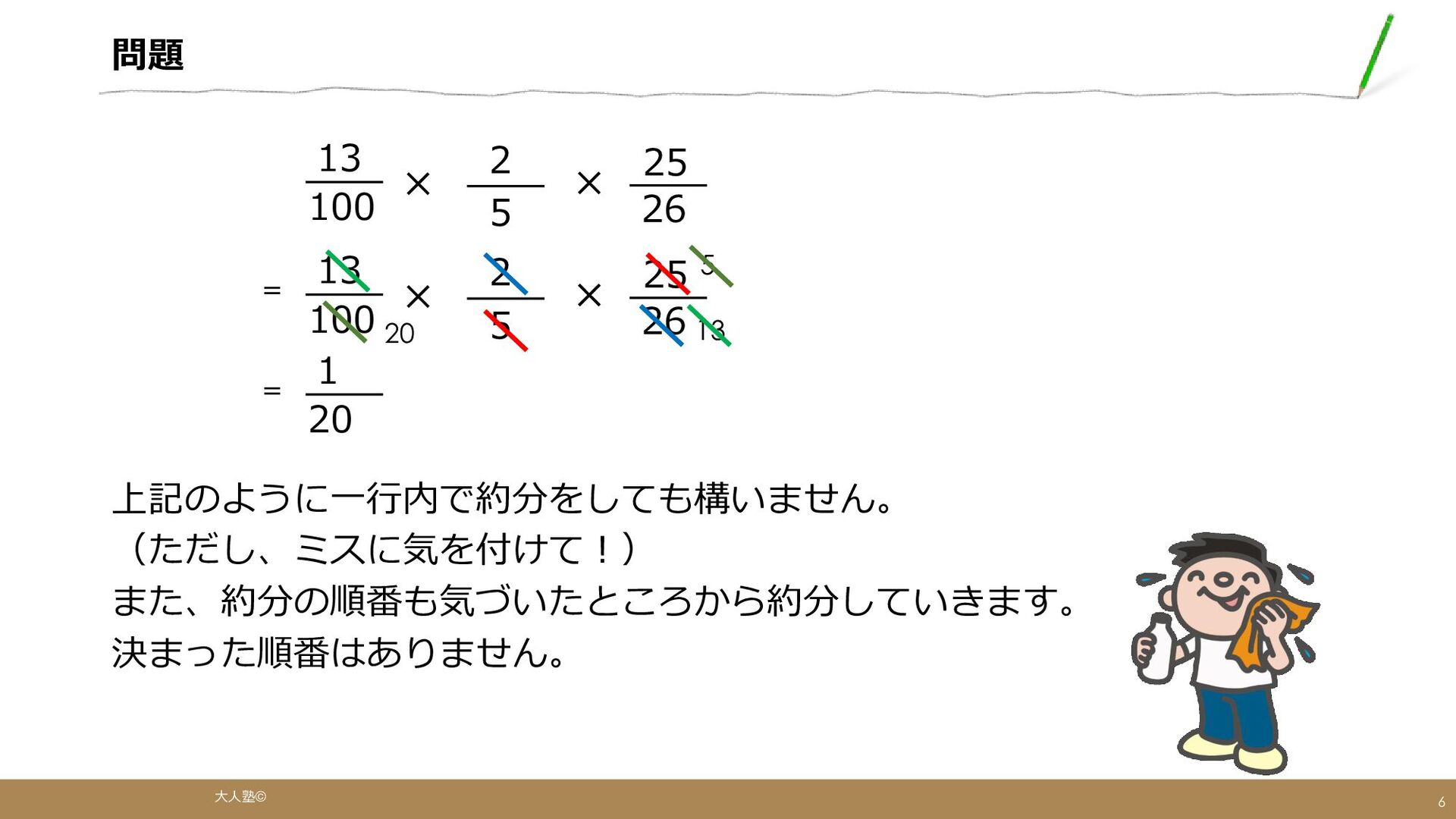 問題 上記のように一行内で約分をしても構いません。 (ただし、ミスに気を付けて!) また、約分の順番も気づいたところから約分していきます。 決まった順番はありません。 大人塾© 6 5 26 25