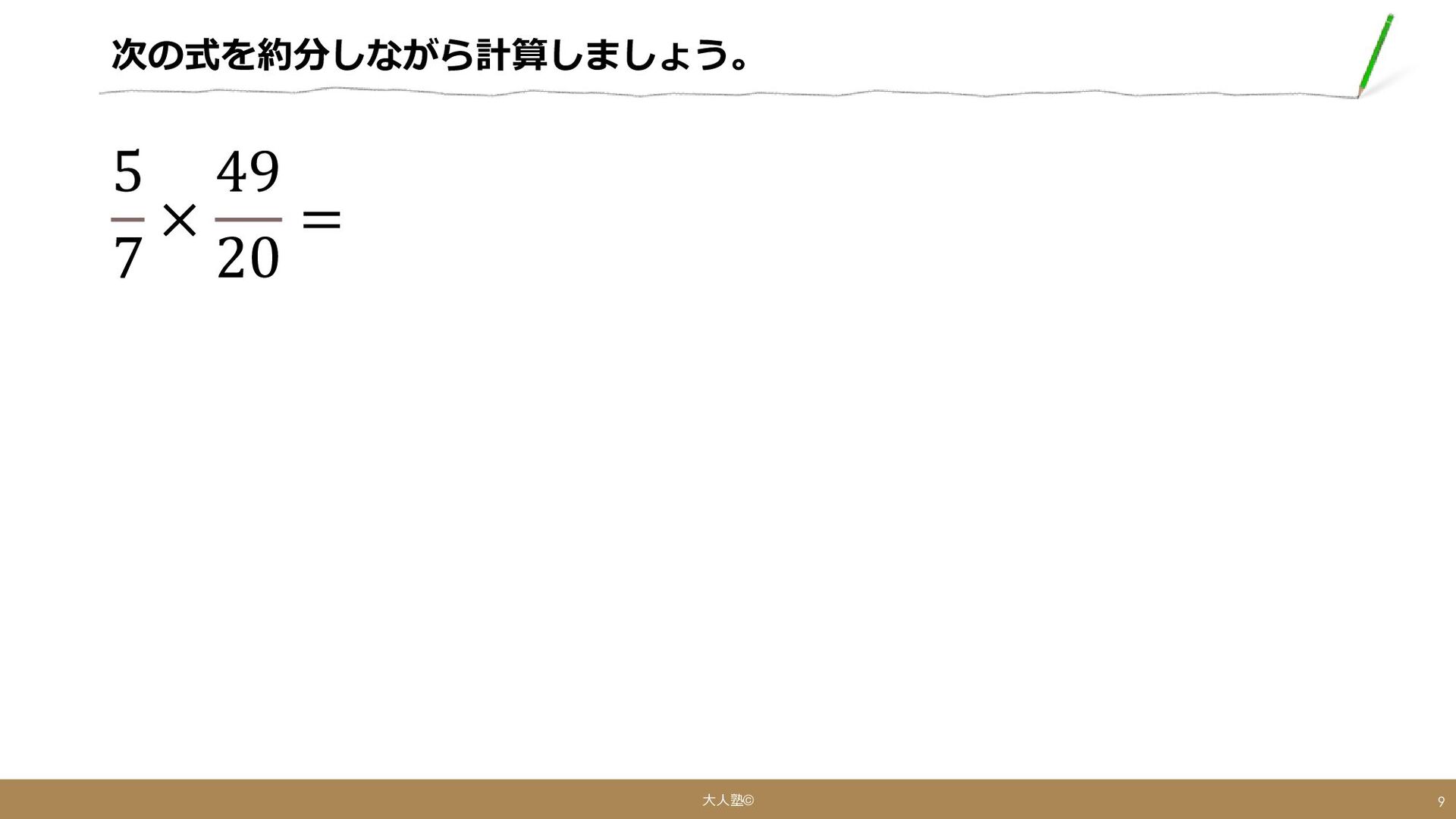 次の式を約分しながら計算しましょう。 大人塾© 9 5 7 × 49 20 =