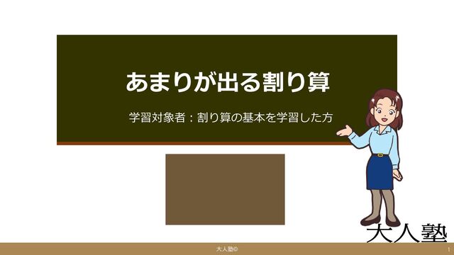 割り算が割り切れない…! そんな時にはびっくりしないで 「あまり」を出してしまいましょう。 ここではあまりの出し方を学びます。 大人塾© 2
