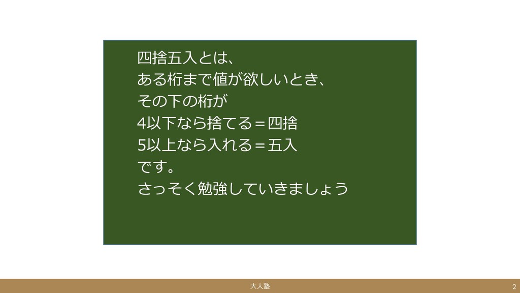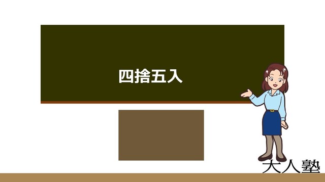 四捨五入とは、 ある桁まで値が欲しいとき、 その下の桁が 4以下なら捨てる=四捨 5以上なら入れる=五入 です。 さっそく勉強していきましょう 大人塾 2