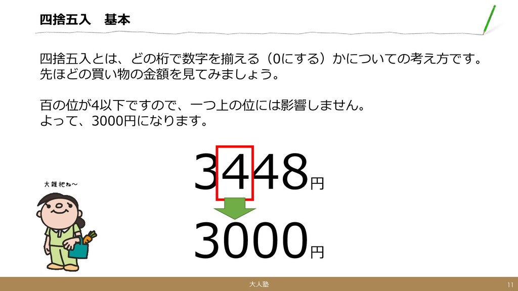 四捨五入 基本 大人塾 11 四捨五入とは、どの桁で数字を揃える(0にする)かについての考え方です。 先ほどの買い物の金額を見てみましょう。 百の位が4以下ですので、一つ上の位には影響しません。 よって、3000円になります。 3448 円