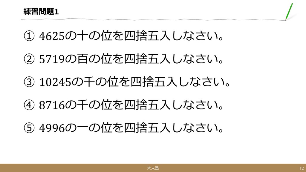 4996の一の位を四捨五入しなさい。 大人塾 12