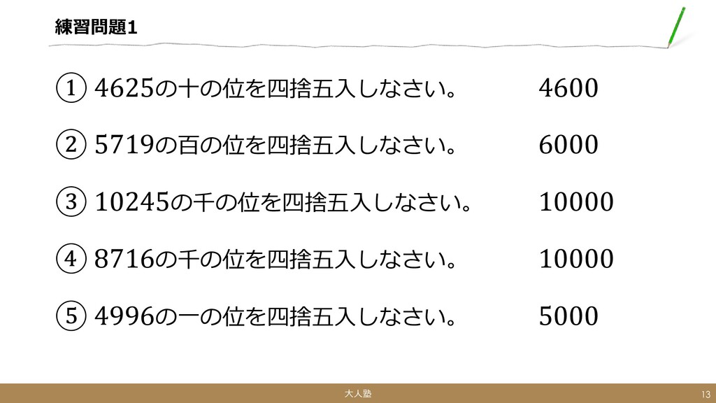 ④ 8716の千の位を四捨五入しなさい。 10000 ⑤ 4996の一の位を四捨五入しなさい。 5000 大人塾 13