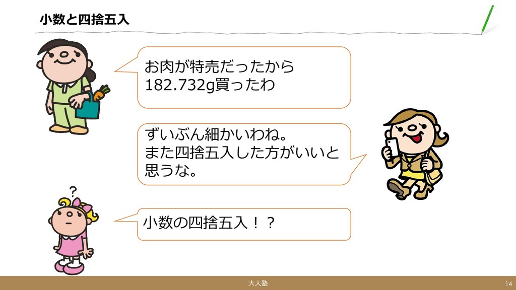 小数と四捨五入 大人塾 14 お肉が特売だったから 182.732g買ったわ ずいぶん細かいわね。 また四捨五入した方がいいと 思うな。 小数の四捨五入!?
