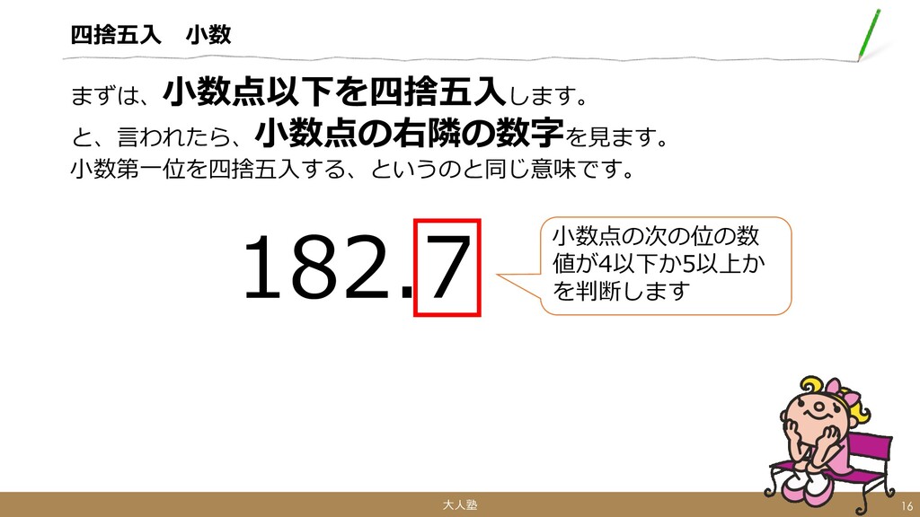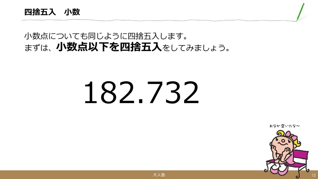 四捨五入 小数 大人塾 15 小数点についても同じように四捨五入します。 まずは、小数点以下を四捨五入をしてみましょう。 182.732 おなか空いたな~