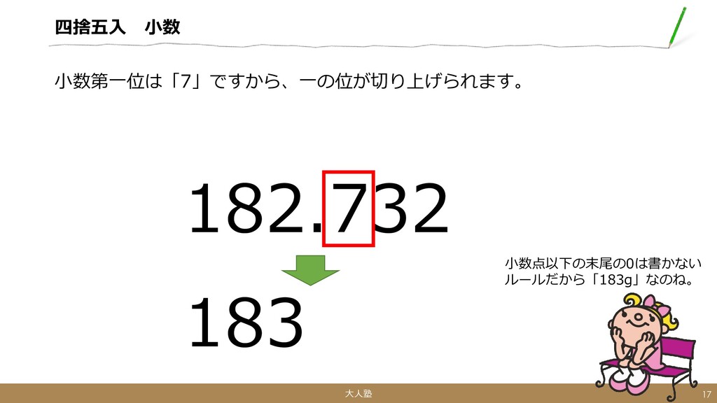 四捨五入 小数 大人塾 17 小数第一位は「7」ですから、一の位が切り上げられます。 182.732 183 小数点以下の末尾の0は書かない ルールだから「183g」なのね。