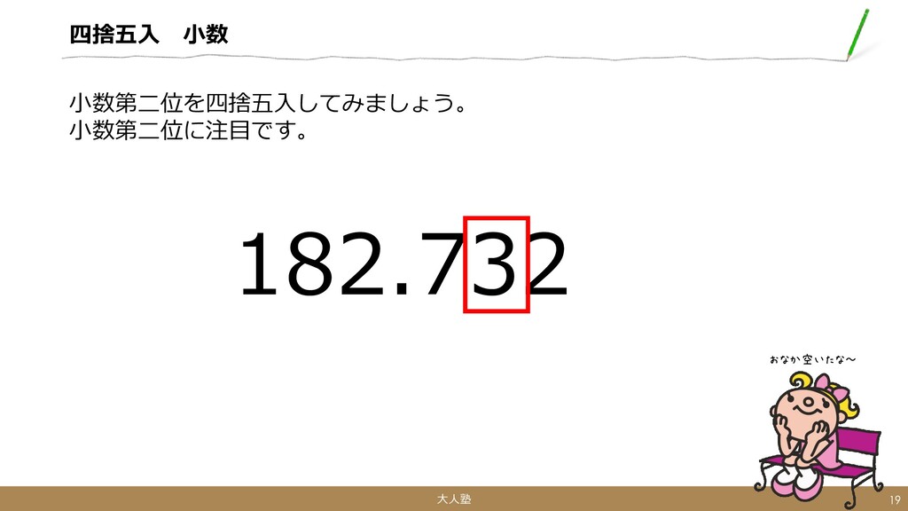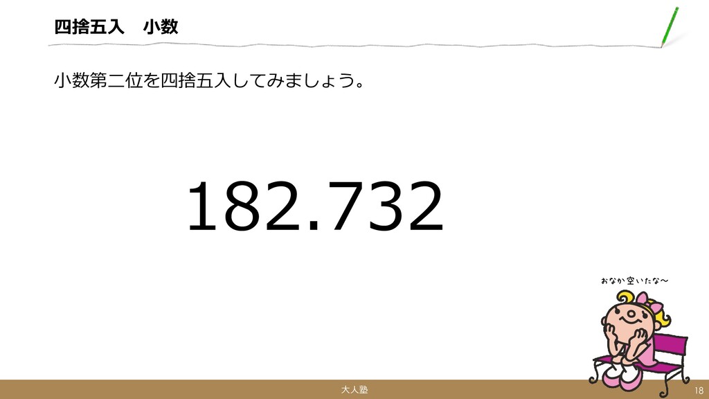 四捨五入 小数 大人塾 18 小数第二位を四捨五入してみましょう。 182.732 おなか空いたな~