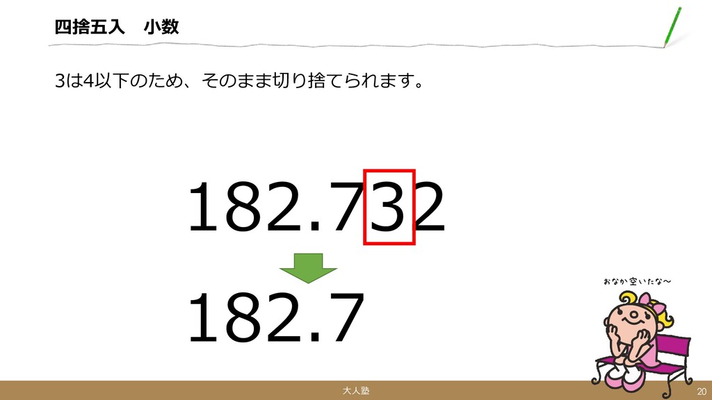 四捨五入 小数 大人塾 20 3は4以下のため、そのまま切り捨てられます。 182.732 おなか空いたな~ 182.7