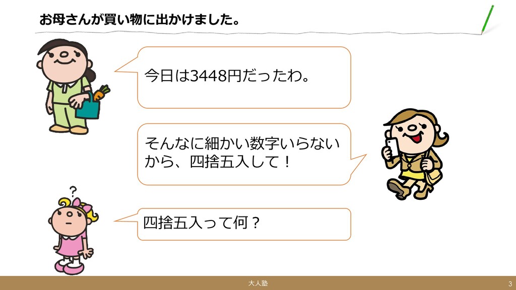 お母さんが買い物に出かけました。 大人塾 3 今日は3448円だったわ。 そんなに細かい数字いらない から、四捨五入して! 四捨五入って何?