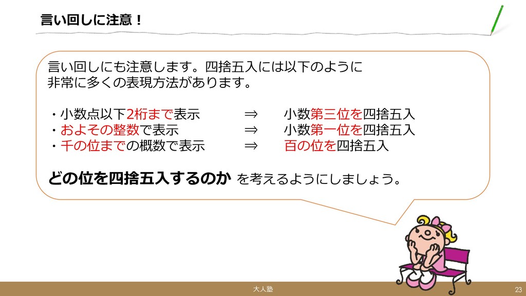 言い回しに注意! 大人塾 23 言い回しにも注意します。四捨五入には以下のように 非常に多くの表現方法があります。 ・小数点以下2桁まで表示 ⇒ 小数第三位を四捨五入 ・およその整数で表示 ⇒