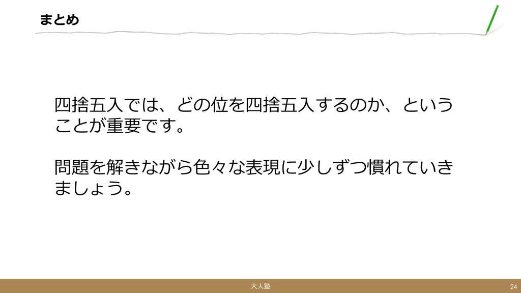 まとめ 大人塾 24 四捨五入では、どの位を四捨五入するのか、という ことが重要です。 問題を解きながら色々な表現に少しずつ慣れていき ましょう。