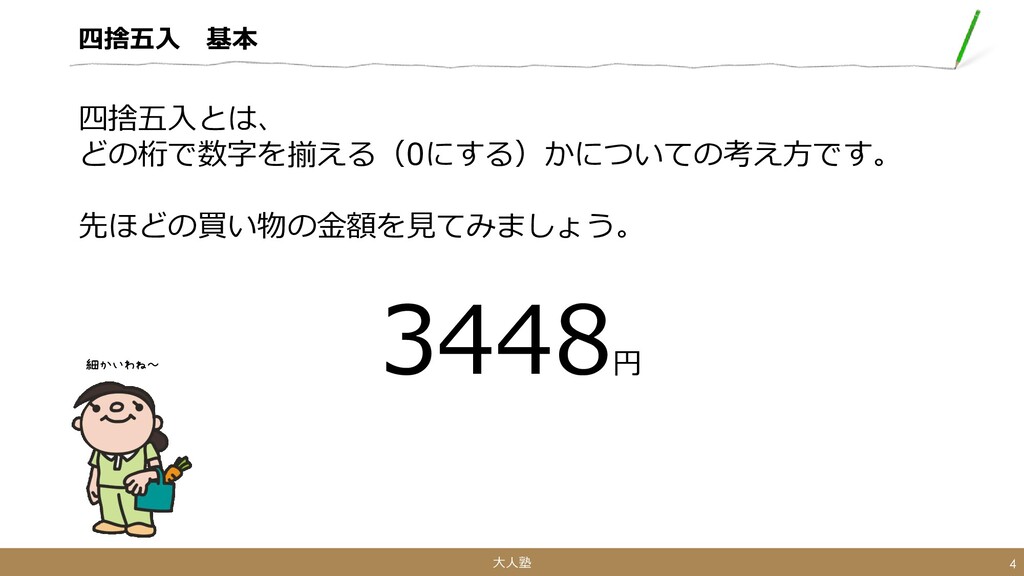 四捨五入 基本 大人塾 4 四捨五入とは、 どの桁で数字を揃える(0にする)かについての考え方です。 先ほどの買い物の金額を見てみましょう。 3448 円 細かいわね~
