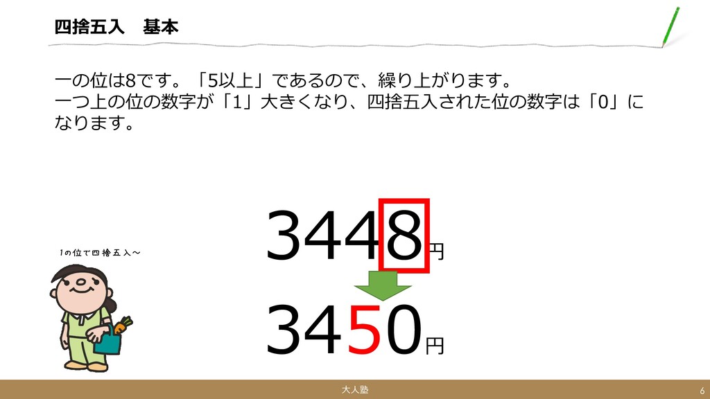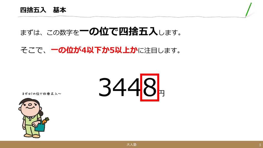 四捨五入 基本 大人塾 5 まずは、この数字を一の位で四捨五入します。 そこで、一の位が4以下か5以上かに注目します。 まずは1の位で四捨五入~ 3448 円