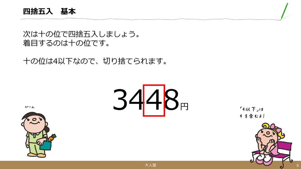 四捨五入 基本 大人塾 7 次は十の位で四捨五入しましょう。 着目するのは十の位です。 3448 円 細かいわね~