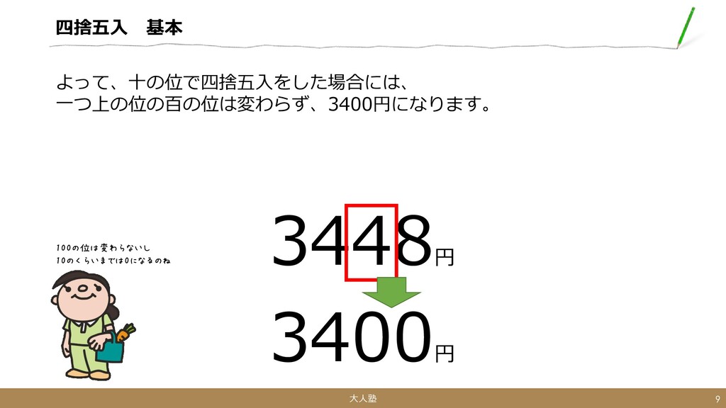 四捨五入 基本 大人塾 9 よって、十の位で四捨五入をした場合には、 一つ上の位の百の位は変わらず、3400円になります。 3448 円 100の位は変わらないし 10のくらいまでは0になるのね