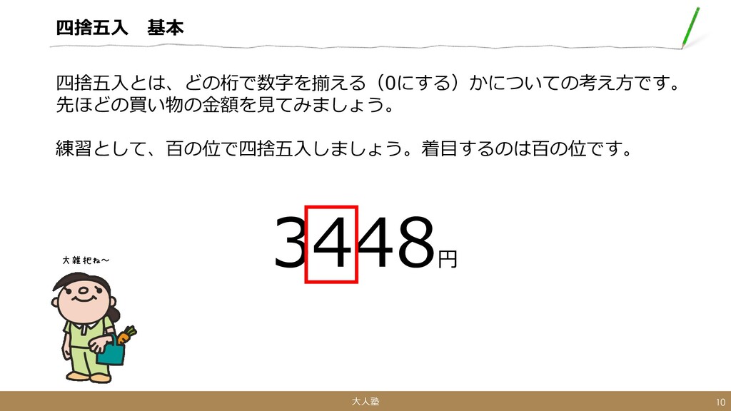 四捨五入 基本 大人塾 10 四捨五入とは、どの桁で数字を揃える(0にする)かについての考え方です。 先ほどの買い物の金額を見てみましょう。 練習として、百の位で四捨五入しましょう。着目するのは百の位です。 3448 円 大雑把ね~