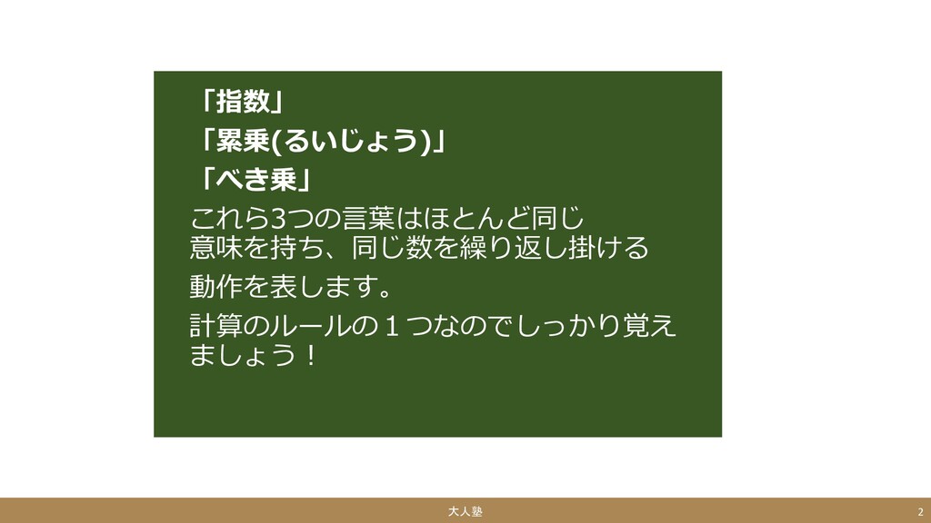 「指数」 「累乗(るいじょう)」 「べき乗」 これら3つの言葉はほとんど同じ 意味を持ち、同じ数を繰り返し掛ける 動作を表します。 計算のルールの1つなのでしっかり覚え ましょう! 大人塾 2