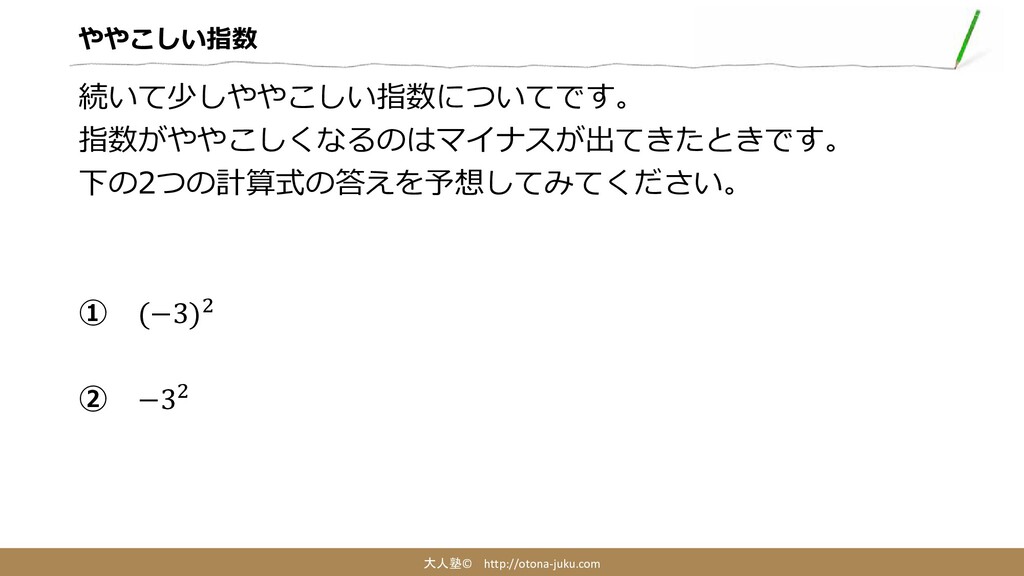 ややこしい指数 大人塾© http://otona-juku.com 続いて少しややこしい指数についてです。 指数がややこしくなるのはマイナスが出てきたときです。 下の2つの計算式の答えを予想してみてください。 ① (−3)2 ② −32