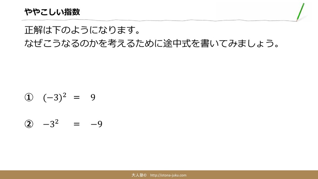 ややこしい指数 大人塾© http://otona-juku.com 正解は下のようになります。 なぜこうなるのかを考えるために途中式を書いてみましょう。 ① (−3)2 = 9 ②