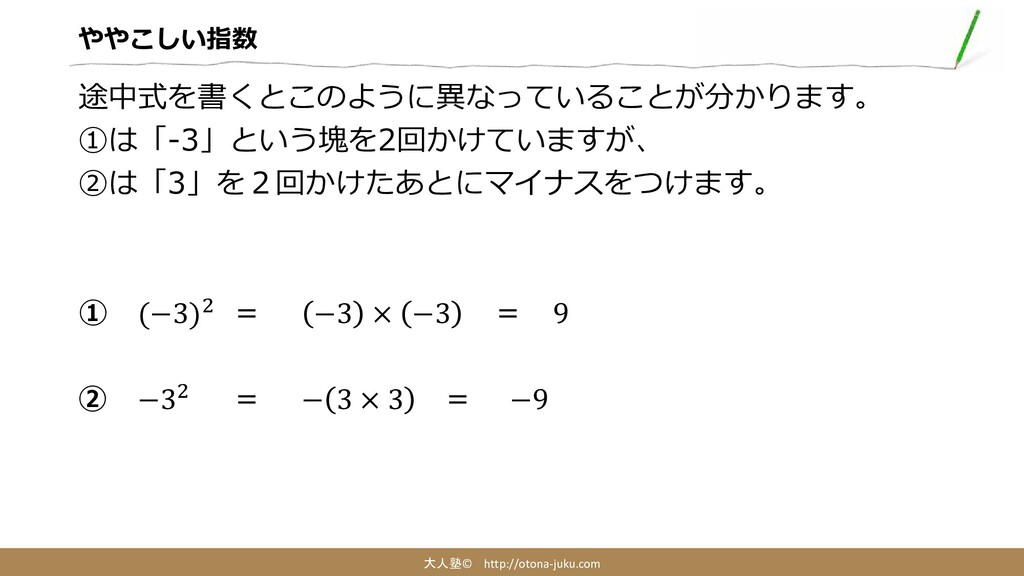 ややこしい指数 大人塾© http://otona-juku.com 途中式を書くとこのように異なっていることが分かります。 ①は「-3」という塊を2回かけていますが、 ②は「3」を2回かけたあとにマイナスをつけます。 ① (−3)2 = −3
