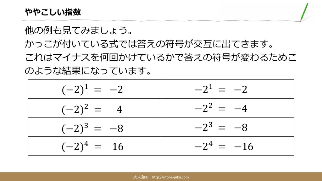 ややこしい指数 大人塾© http://otona-juku.com 他の例も見てみましょう。 かっこが付いている式では答えの符号が交互に出てきます。 これはマイナスを何回かけているかで答えの符号が変わるためこ のような結果になっています。 (−2)1 = −2