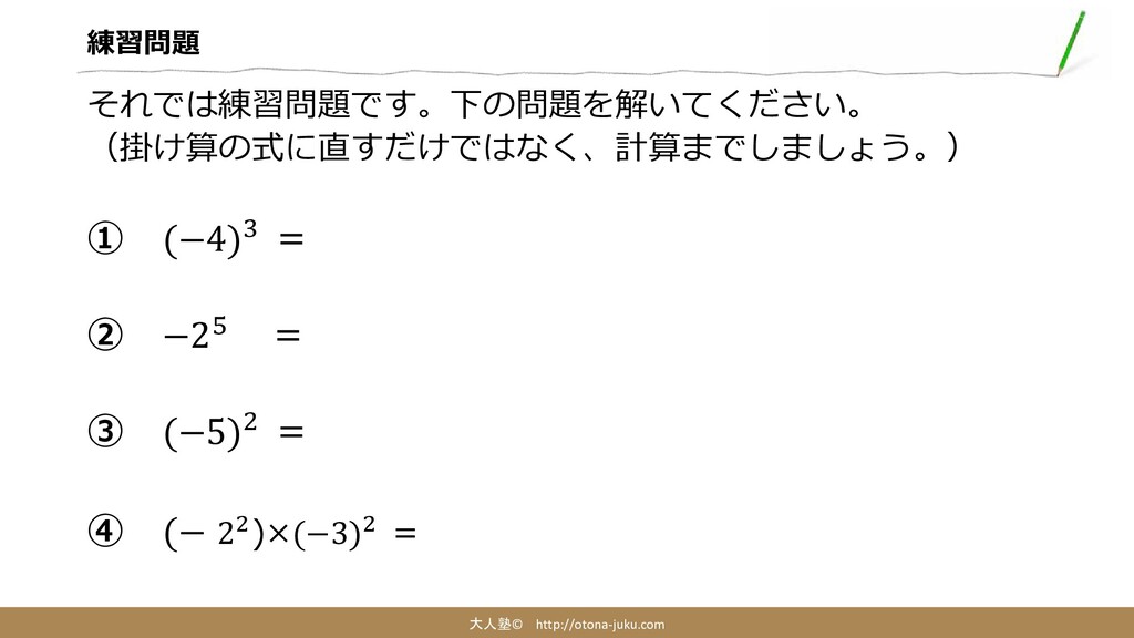 練習問題 大人塾© http://otona-juku.com それでは練習問題です。下の問題を解いてください。 (掛け算の式に直すだけではなく、計算までしましょう。) ① (−4)3 = ② −25