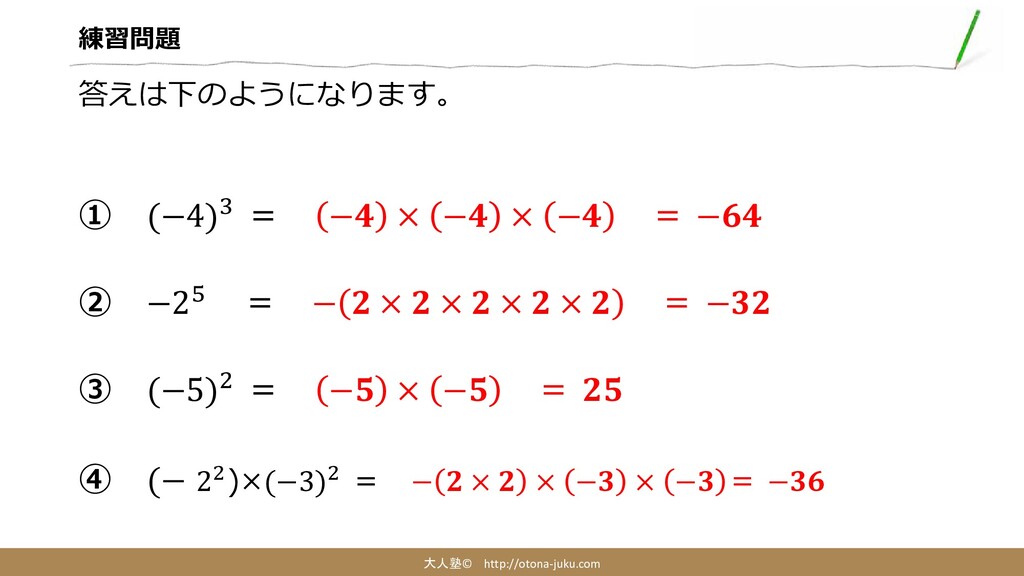 練習問題 大人塾© http://otona-juku.com 答えは下のようになります。 ① (−4)3 = −𝟒𝟒 × −𝟒𝟒