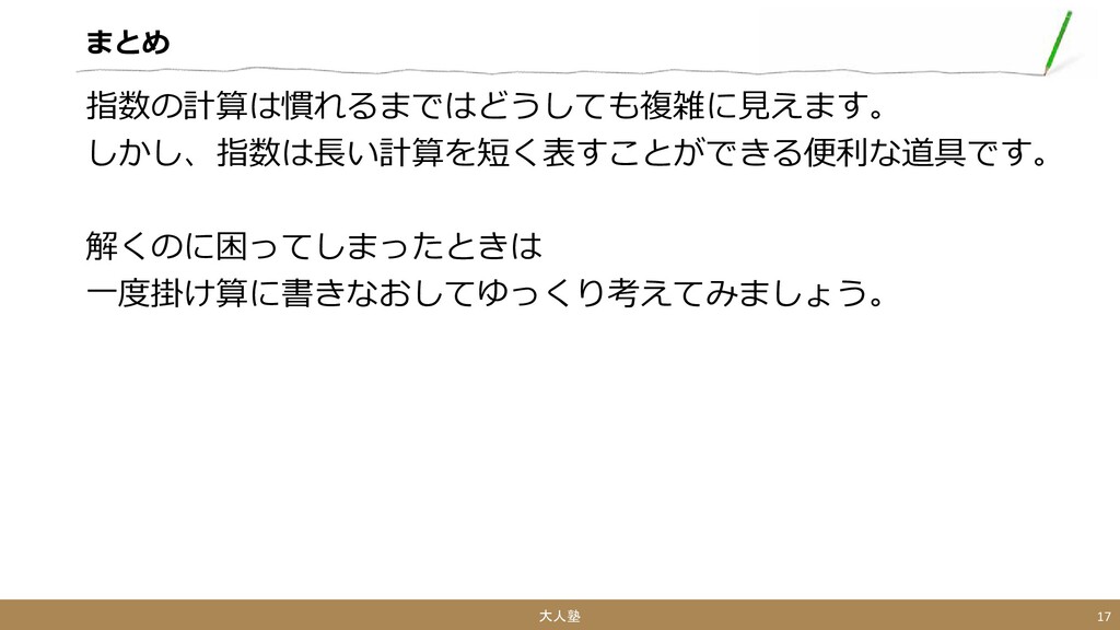 まとめ 指数の計算は慣れるまではどうしても複雑に見えます。 しかし、指数は長い計算を短く表すことができる便利な道具です。 解くのに困ってしまったときは 一度掛け算に書きなおしてゆっくり考えてみましょう。 大人塾 17