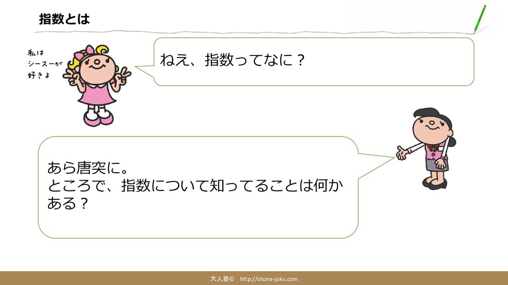 指数とは 大人塾© http://otona-juku.com ねえ、指数ってなに? あら唐突に。 ところで、指数について知ってることは何か ある? 私は シースーが 好きよ