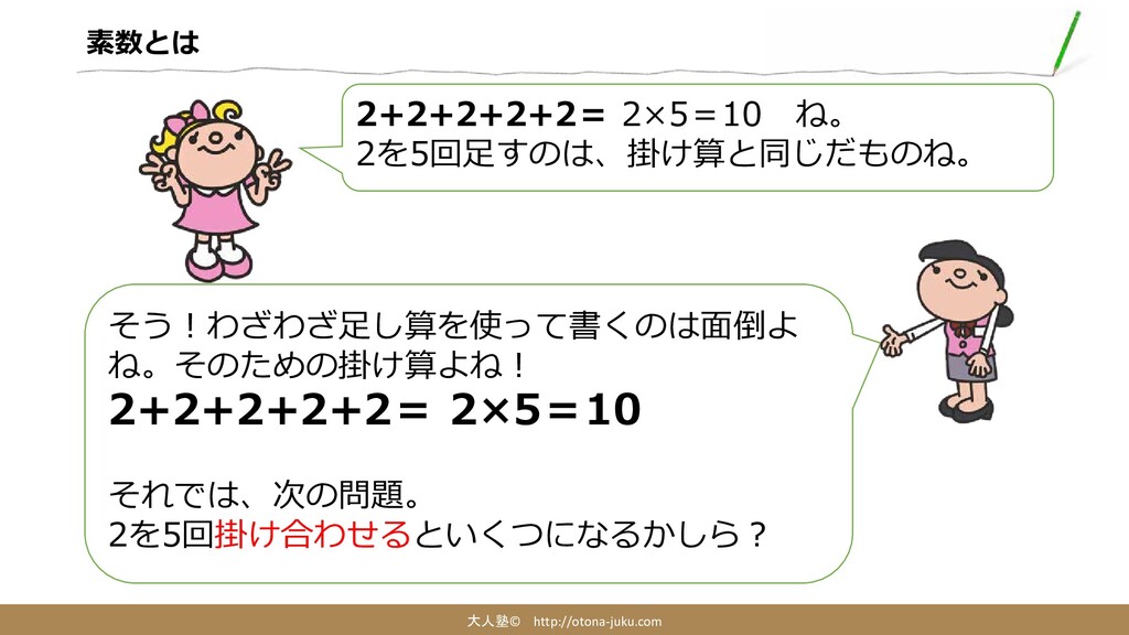 素数とは 大人塾© http://otona-juku.com 2+2+2+2+2= 2×5=10 ね。 2を5回足すのは、掛け算と同じだものね。 そう!わざわざ足し算を使って書くのは面倒よ ね。そのための掛け算よね! 2+2+2+2+2=