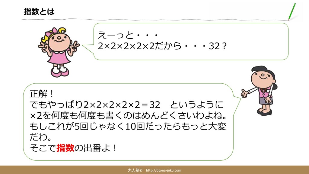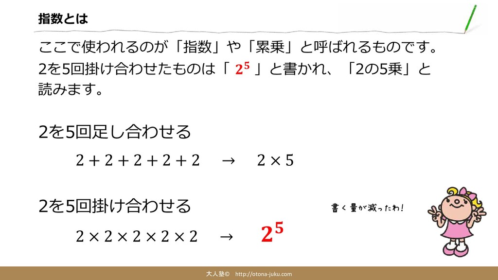指数とは 大人塾© http://otona-juku.com えーっと・・・ 2×2×2×2×2だから・・・32? 正解! でもやっぱり2×2×2×2×2=32 というように ×2を何度も何度も書くのはめんどくさいわよね。 もしこれが5回じゃなく10回だったらもっと大変