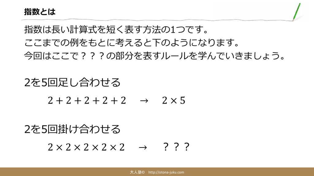 指数とは 大人塾© http://otona-juku.com 指数は長い計算式を短く表す方法の1つです。 ここまでの例をもとに考えると下のようになります。 今回はここで???の部分を表すルールを学んでいきましょう。 2を5回足し合わせる 2 + 2