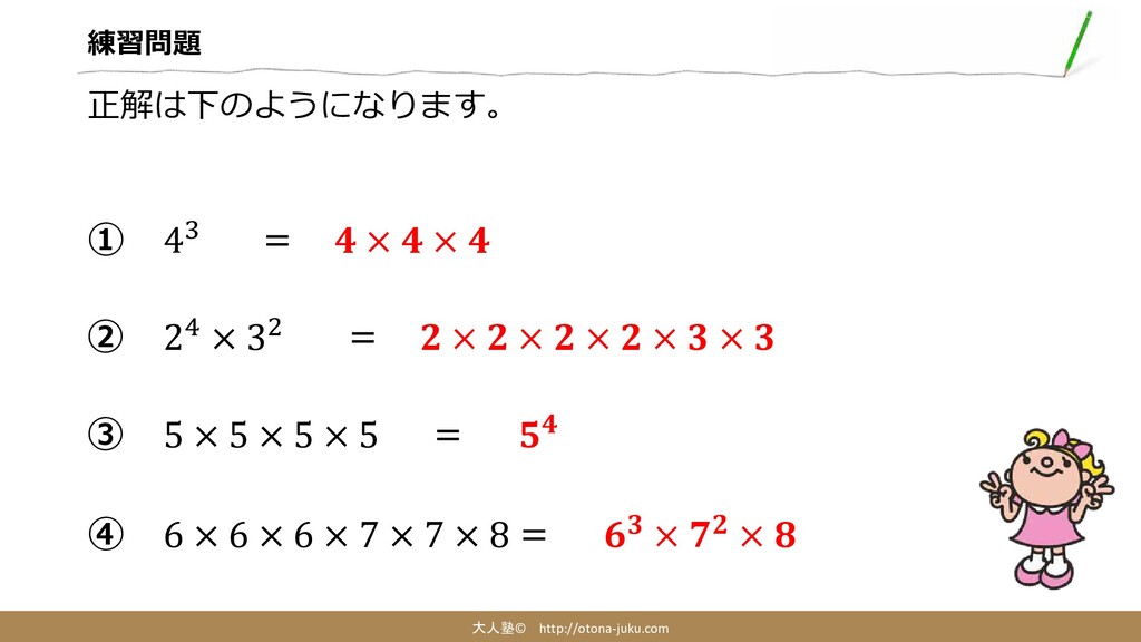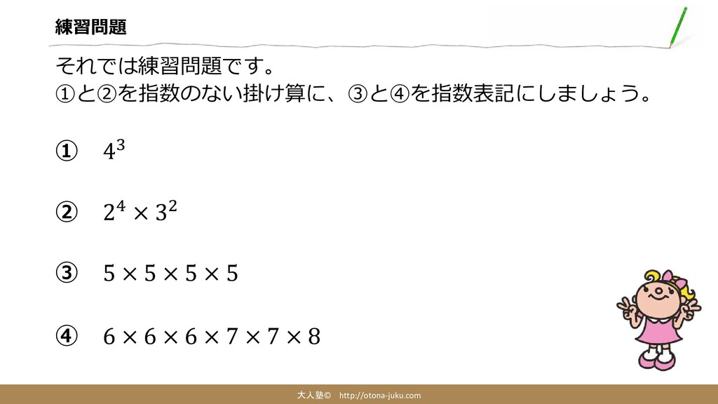 練習問題 大人塾© http://otona-juku.com それでは練習問題です。 ①と②を指数のない掛け算に、③と④を指数表記にしましょう。 ① 43 ② 24 ×