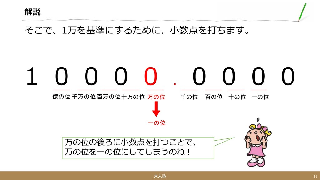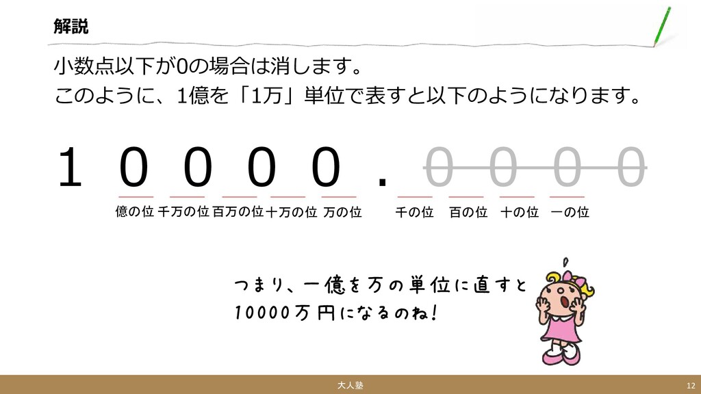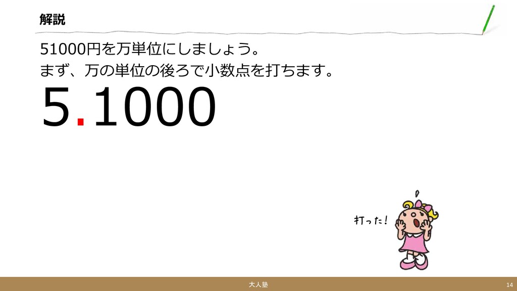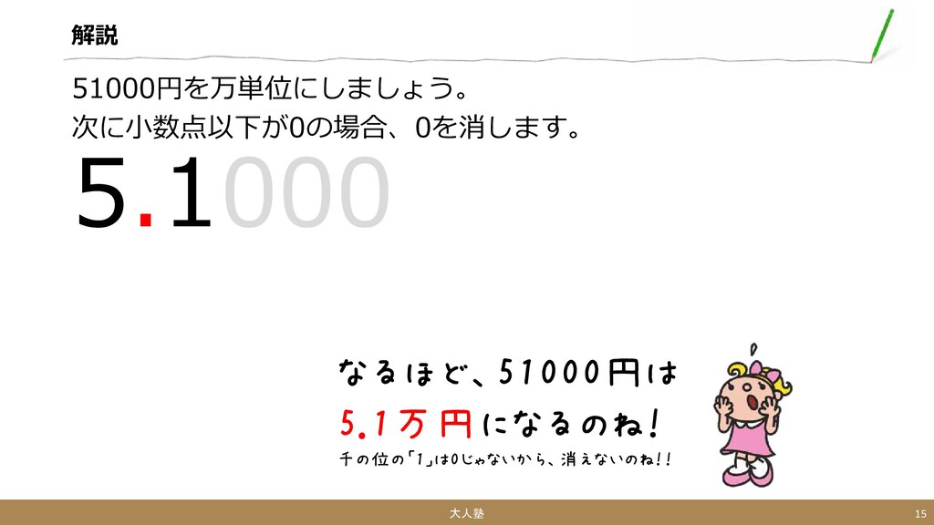 解説 51000円を万単位にしましょう。 次に小数点以下が0の場合、0を消します。 5.1000 大人塾 15 なるほど、51000円は 5.1万円になるのね! 千の位の「1」は0じゃないから、消えないのね!!