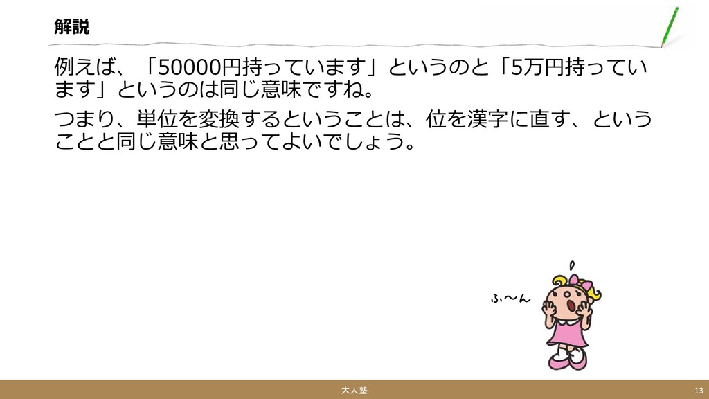 解説 例えば、「50000円持っています」というのと「5万円持ってい ます」というのは同じ意味ですね。 つまり、単位を変換するということは、位を漢字に直す、という ことと同じ意味と思ってよいでしょう。 大人塾 13 ふ~ん