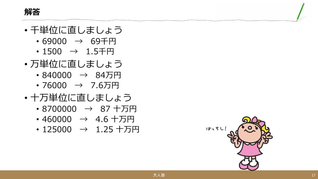 1.5千円 • 万単位に直しましょう • 840000 → 84万円 • 76000 → 7.6万円 • 十万単位に直しましょう • 8700000 → 87 十万円 • 460000 → 4.6 十万円 • 125000 → 1.25 十万円 大人塾 17 ばっちし!