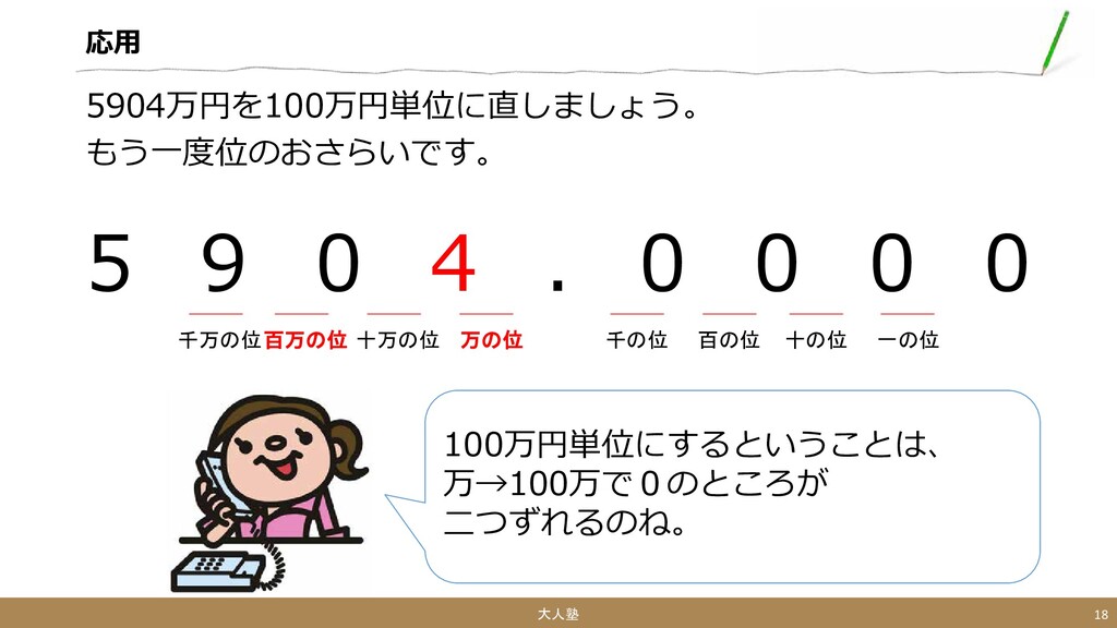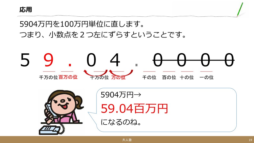 0 0 0 大人塾 19 一の位 十の位 百の位 千の位 万の位 十万の位 百万の位 千万の位 5904万円→ 59.04百万円 になるのね。
